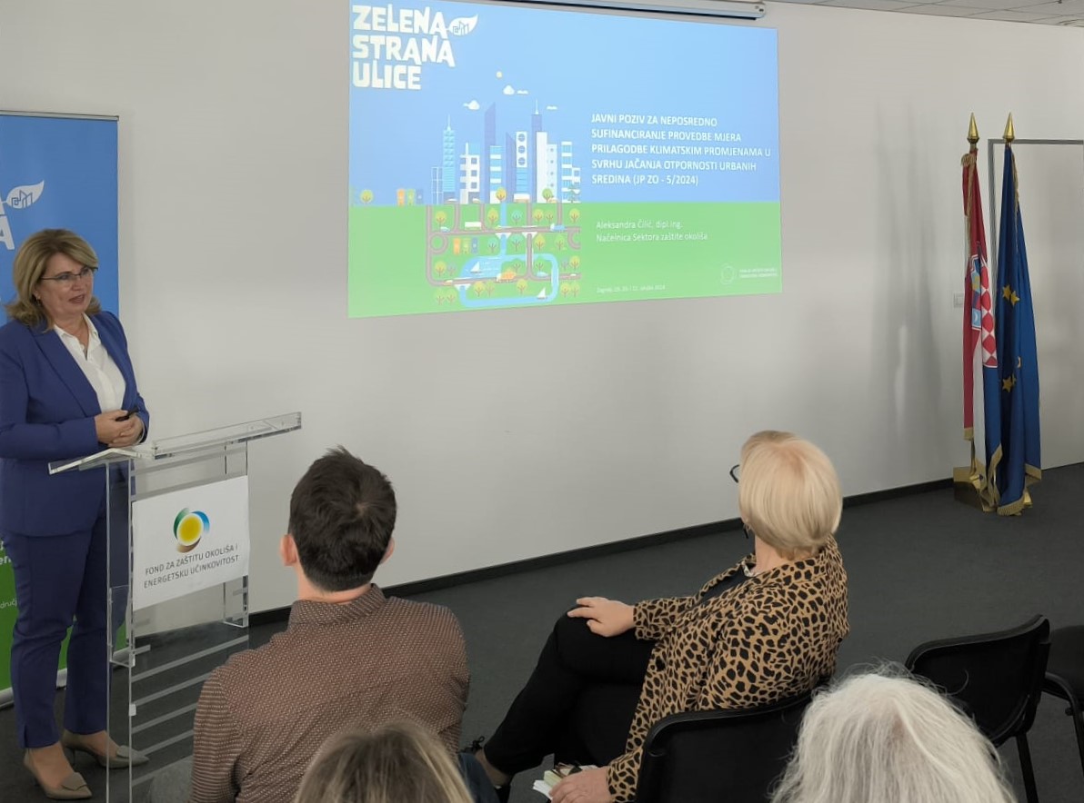 Aleksandra Čilić, načelnica Fondovog Sektora zaštite okoliša naglasila je ranjivost Hrvatske kao mediteranske zemlje na klimatske promjene. „To je samo razlog više za jačanje otpornosti naših gradova i drugačije promišljanje urbanizma, kojeg smo mi u Fondu nazvali „Zelena strana ulice“. Kroz naše se pozive sufinancira izrada zelenih nadstrešnica, sadnja drveća, ozelenjivanje javnih parkirališta i parkova, mreže za pješačenje, javne slavine, strateški dokumenti, projekti razmjene iskustava, ali i programi edukacije“ navela je Čilić te pohvalila primjere dobre prakse gradova i općina koje su svoje projekte već uspješno dovršili.
