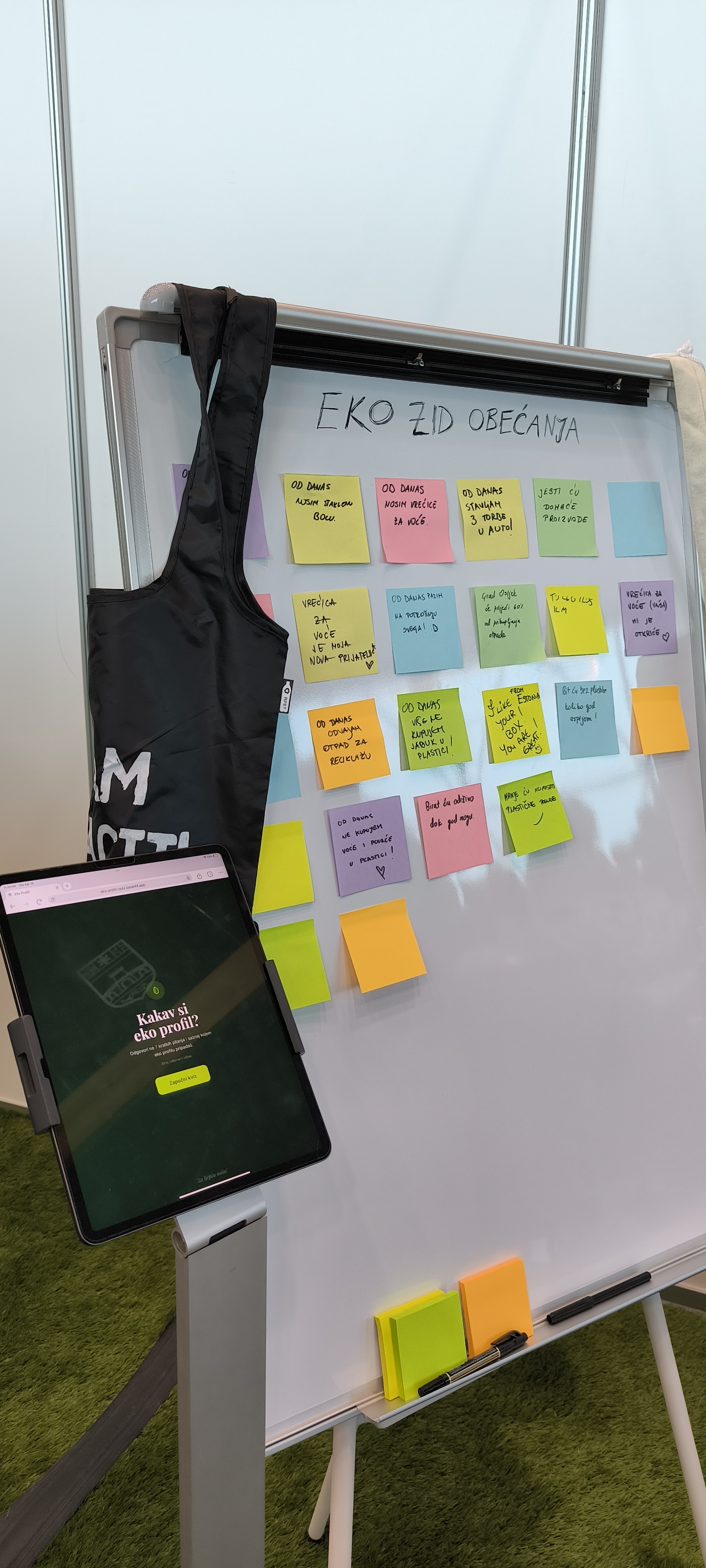 Posebnu pažnju izazvao je i „Eko zid obećanja“, na kojem su posjetitelji ostavljali svoja osobna ekološka obećanja - sve od malih promjena u svakodnevnim navikama do konkretnih odluka o smanjenju korištenja plastike. Zid je tako tijekom dana postao vizualna poruka zajedničke odgovornosti i spremnosti na promjene, ispunjen porukama poput “Birat ću održivo dok god mogu” i “Od danas ne kupujem voće i povrće u plastici”.